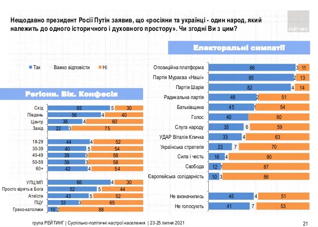 На сході країни, а також серед прихожан УПЦ МП з такою думкою погоджуються більше 60%. Серед мешканців західного регіону, навпаки, більше 70% незгоді з цим. Більше 80% виборців «Опозиційної платформи-За життя», партій Євгена Мураєва і Анатолія Шарія погоджуються з тезою про «один народ».
