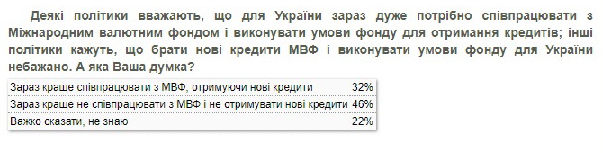 Згідно з результатами опитування, 32% респондентів вважають, що Україні краще співпрацювати з МВФ, отримуючи нові кредити. 46% стверджують, що робити цього не варто. П'ята половина опитаних – 22% – не змогли відповісти на поставлене питання.