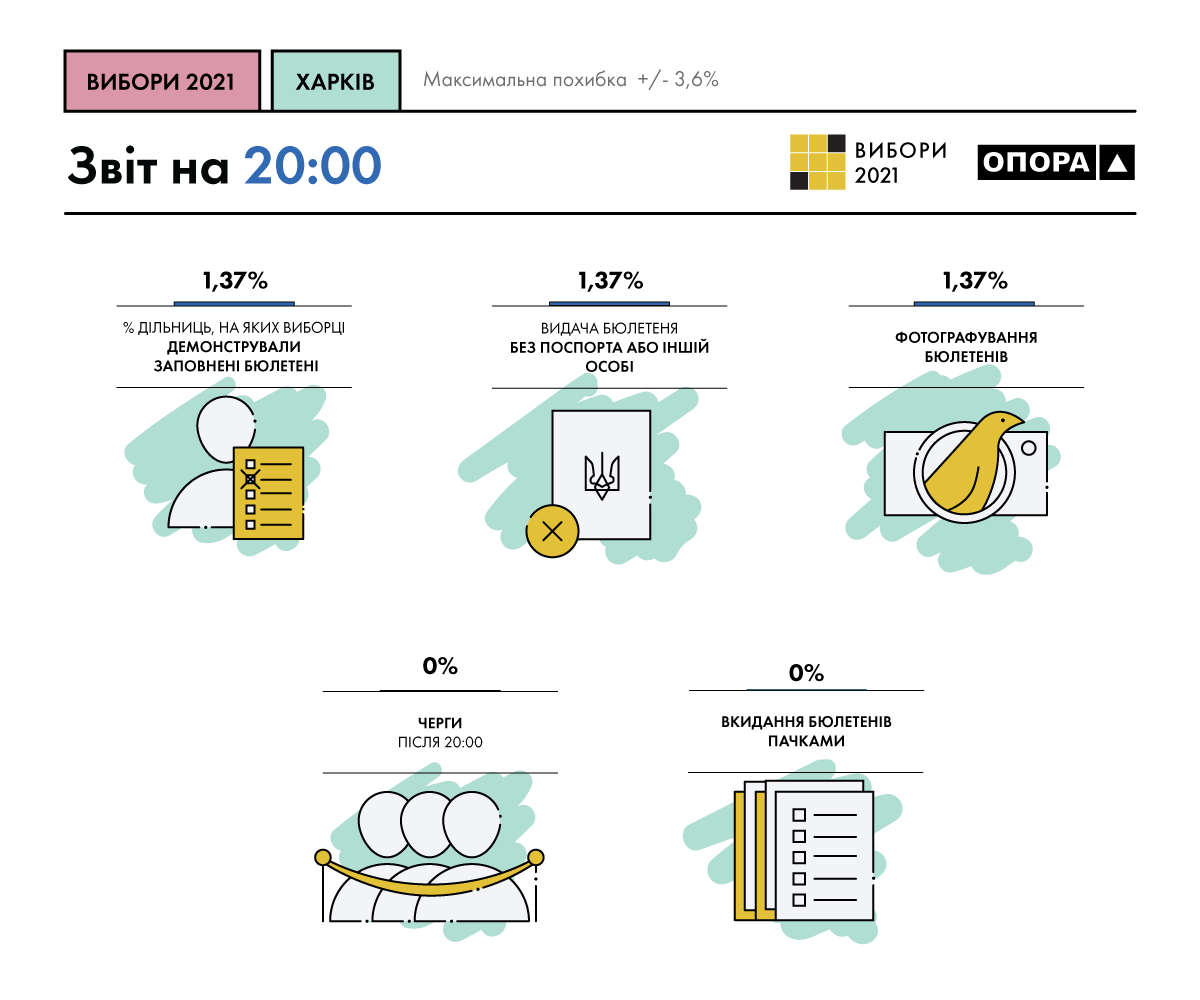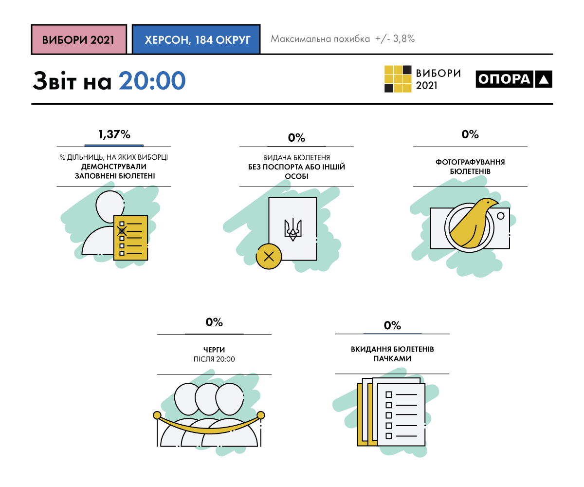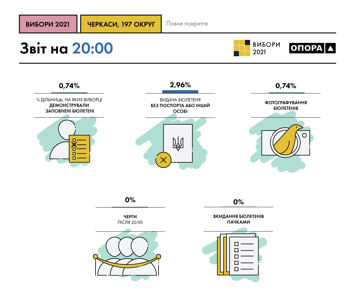Водночас спостерігачі ОПОРИ констатують відсутність масових порушень виборчих процедур з боку членів ДВК та інших суб'єктів виборчого процесу на позачергових виборах харківського міського голови та проміжних виборах народних депутатів у ОВО №184 (Херсонська обл.) та ОВО №197 (Черкаська обл.) у період між 16:00 та 20:00.