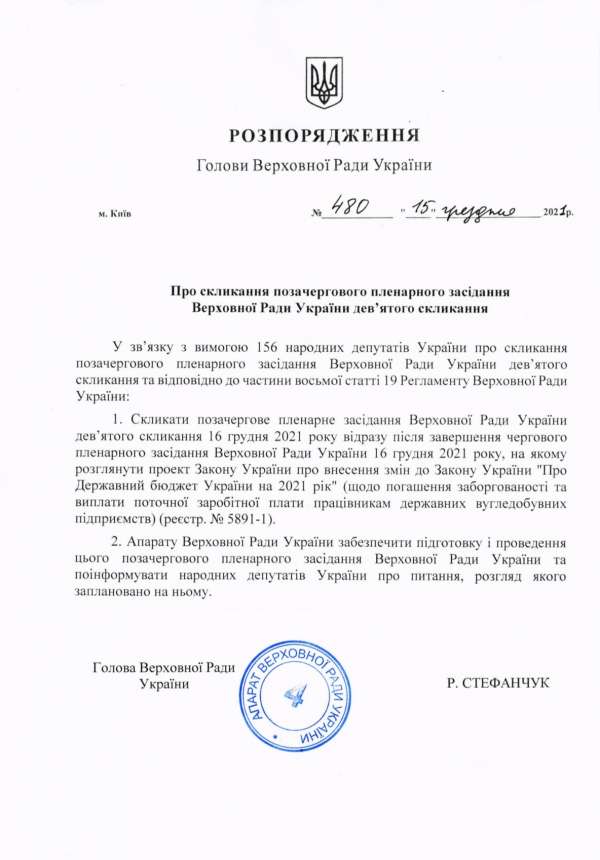Спікер Верховної Ради Руслан Стефанчук підписав розпорядження про скликання 16 грудня позачергового засідання парламенту, повідомили у пресслужбі ВР. У порядку денному всього одне питання.