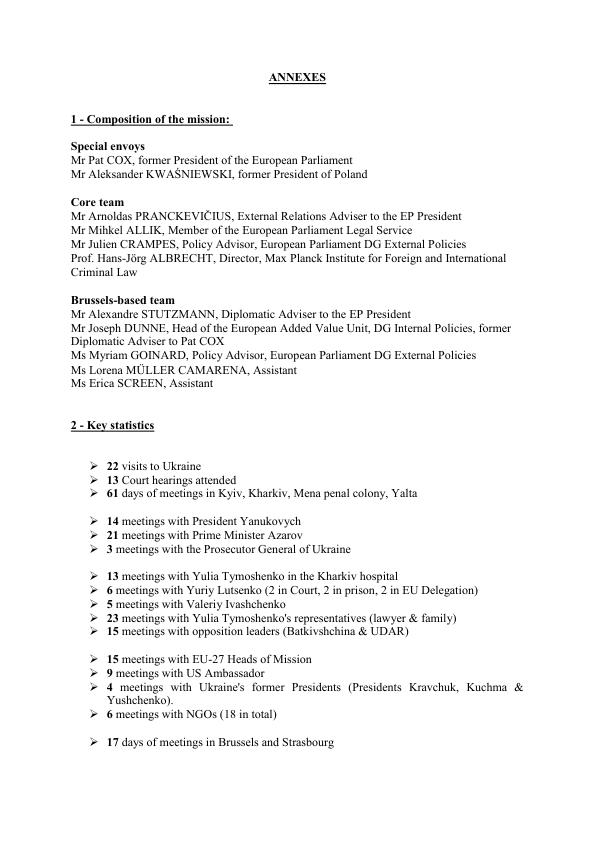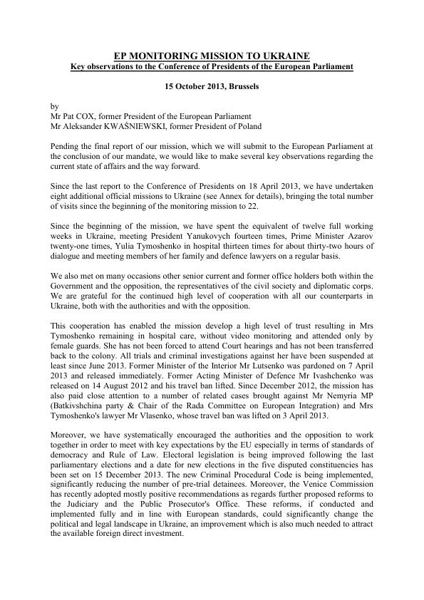 У розпорядження ZN.UA потрапив текст доповіді екс-президента Європарламенту Пета Кокса та екс-президента Польщі Олександра Кваснєвського 15 жовтня на позачерговому засіданні конференції президентів (конференція президентів - керівний орган Європарламенту, до складу якого входять президент Європарламенту Мартін Шульц і президенти політичних груп).