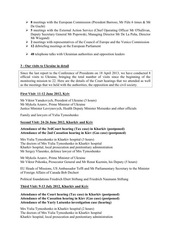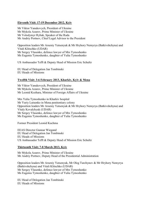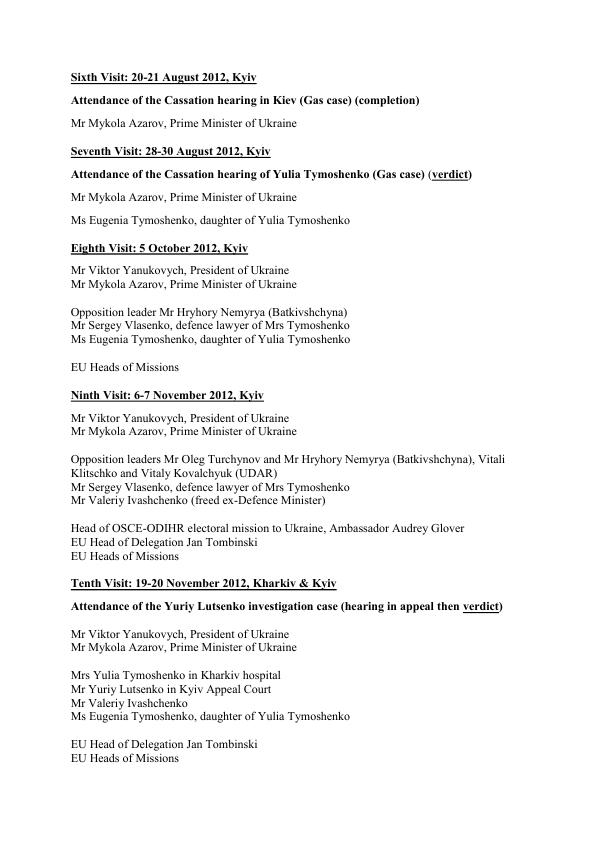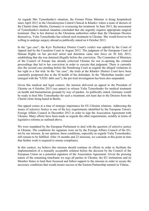 Юлія Тимошенко у свою чергу заявила, що місія Європарламенту передала їй офіційну пропозицію про можливий виїзд до Німеччини для лікування. Екс-прем'єр-міністр України публічно прийняла цю пропозицію, враховуючи важливість для України підписання угоди з ЄС про асоціацію. !zn