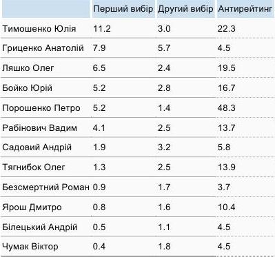 Як зазначається в повідомленні КМІС, з цих кандидатів більше, ніж інші, враховуючи статистичну похибку, має Тимошенко. Другу сходинку скоріше ділять Гриценко і Ляшко, третю – Бойко, Порошенко, Рабінович.