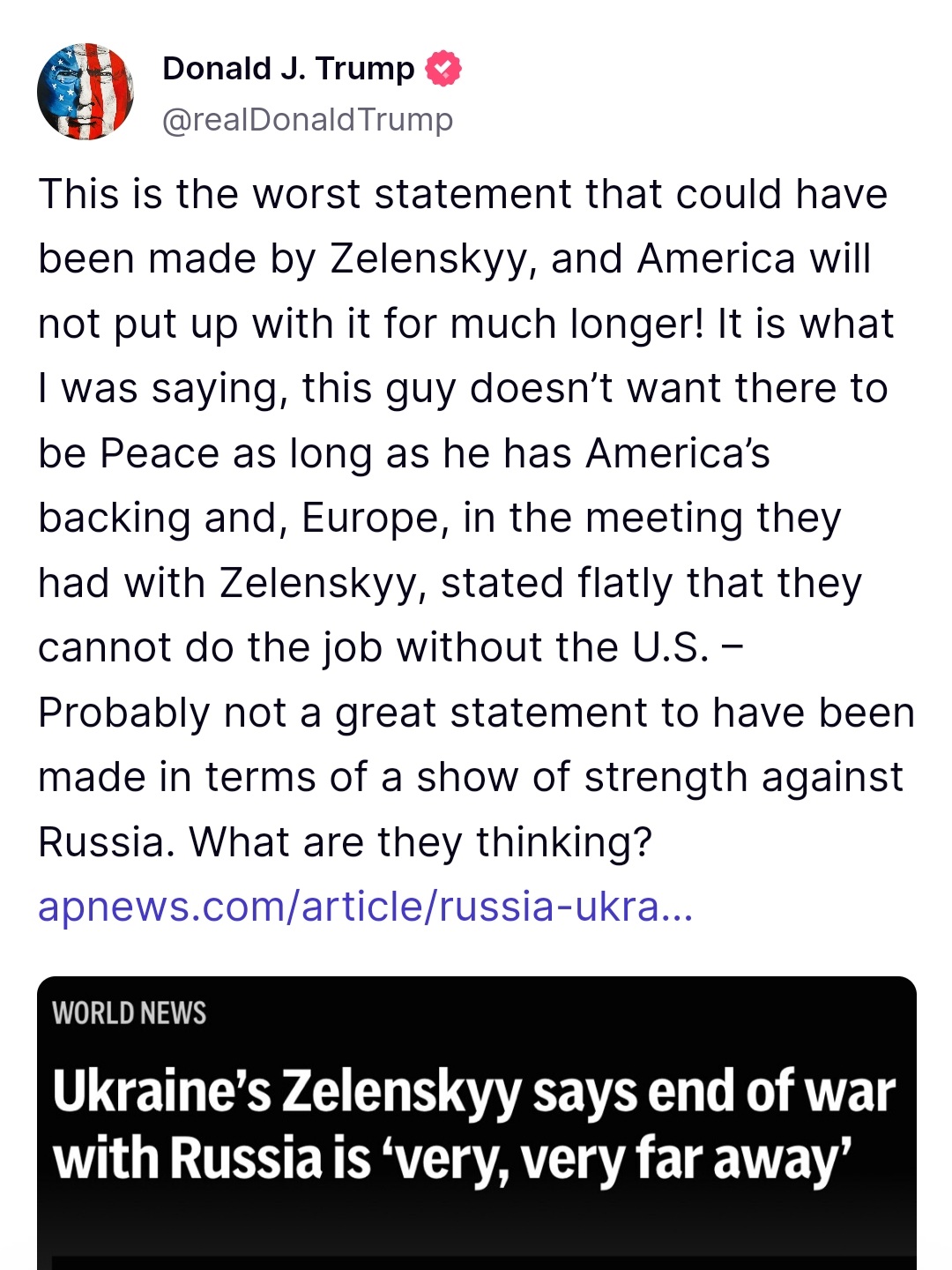 "Це те, що я говорив, цей хлопець не хоче, щоб був мир, доки в нього є американська опора, і Європа, на зустрічі, яку вони провели із Зеленським, прямо заявила, що вони не можуть виконувати роботу без США", - написав американський президент.
