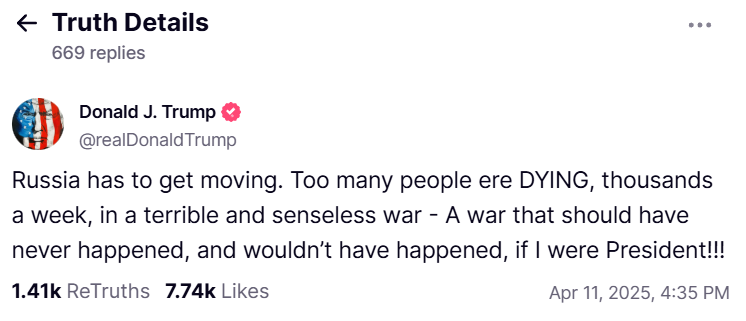 "Росія повинна почати діяти. Занадто багато людей гине, тисячі щотижня, у жахливій і безглуздій війні ― війні, яка ніколи не повинна була статися, і яка не сталася б, якби я був президентом!!!", ― написав Трамп.