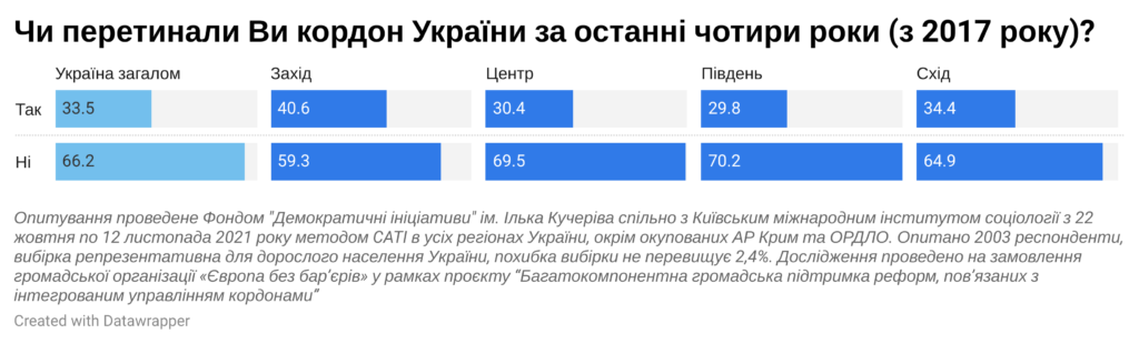 Аналітичний центр Європа без бар'єрів у співпраці з Фондом Демократичні ініціативи імені Ілька Кучеріва провели соціологічне дослідження, щоб з'ясувати кількість українців, які перетинали кордон починаючи з 2017 року. Підсумкові дані розміщені на сайті Європа без бар'єрів.