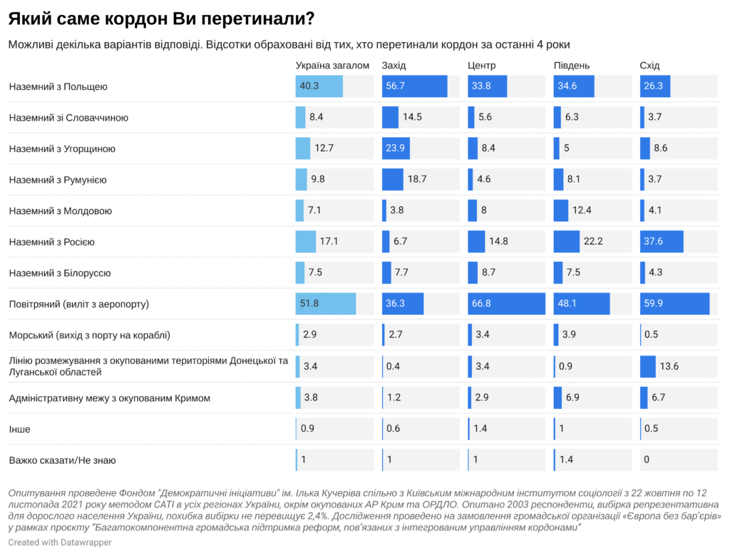 Найпопулярнішим видом подорожей для громадян України є авіапереліт — 52%. Ще 40% відзначили, що вони перетинали наземний кордон із Польщею, близько 17% перетинали наземний кордон із РФ, ще 13% перетинали наземний кордон із Угорщиною.