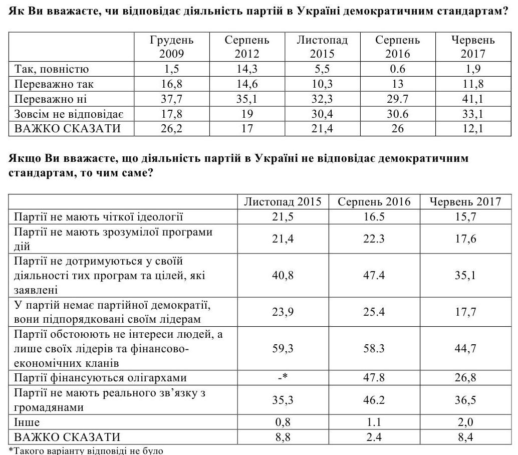 Серед основних причин того, чому діяльність партій не відповідає демократичним стандартам, українці найчастіше згадували те, що партії відстоюють інтереси лише своїх лідерів і фінансових спонсорів (45%), не мають реального зв'язку з громадянами (36,5%) та не дотримуються задекларованих цілей і обіцянок (35%).