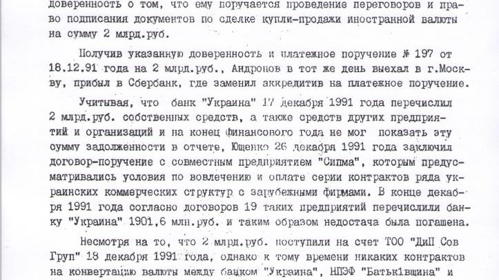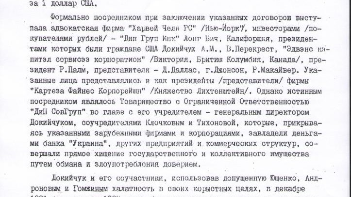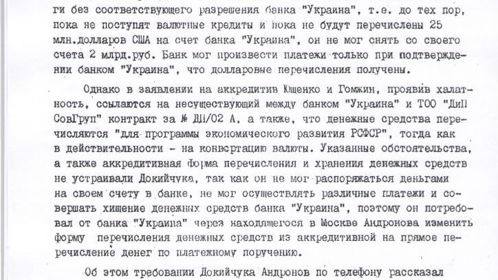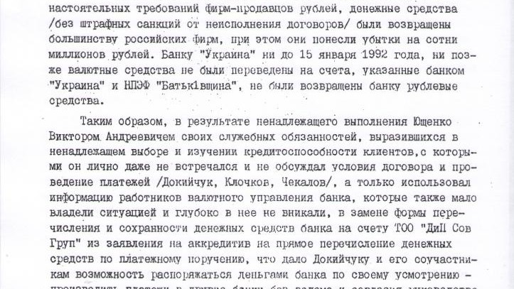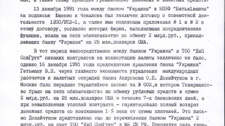 Згідно з документом, у 1991 році посадові особи акціонерного комерційного агропромислового банку "Україна" перевели в Москву два мільярди радянських карбованців для обміну на 25 мільйонів доларів США. У подальшому ці гроші були привласнені шахрайським шляхом, і Ющенко, який на той час був заступником голови правління банку, нібито був причетний до цього.