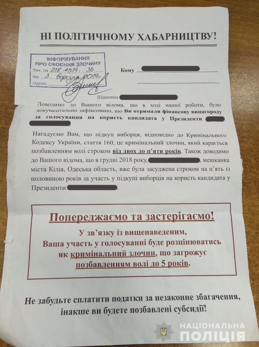 У Чернігові у поштові скриньки місцевих жителів розкидали листівки з погрозами та застереженнями перед виборами. Як повідомляє сьогодні прес-служба поліції Чернігівської області, у листівках зі штампом та підписом невідомої особи погрожують кримінальним переслідуванням за "політичне хабарництво".