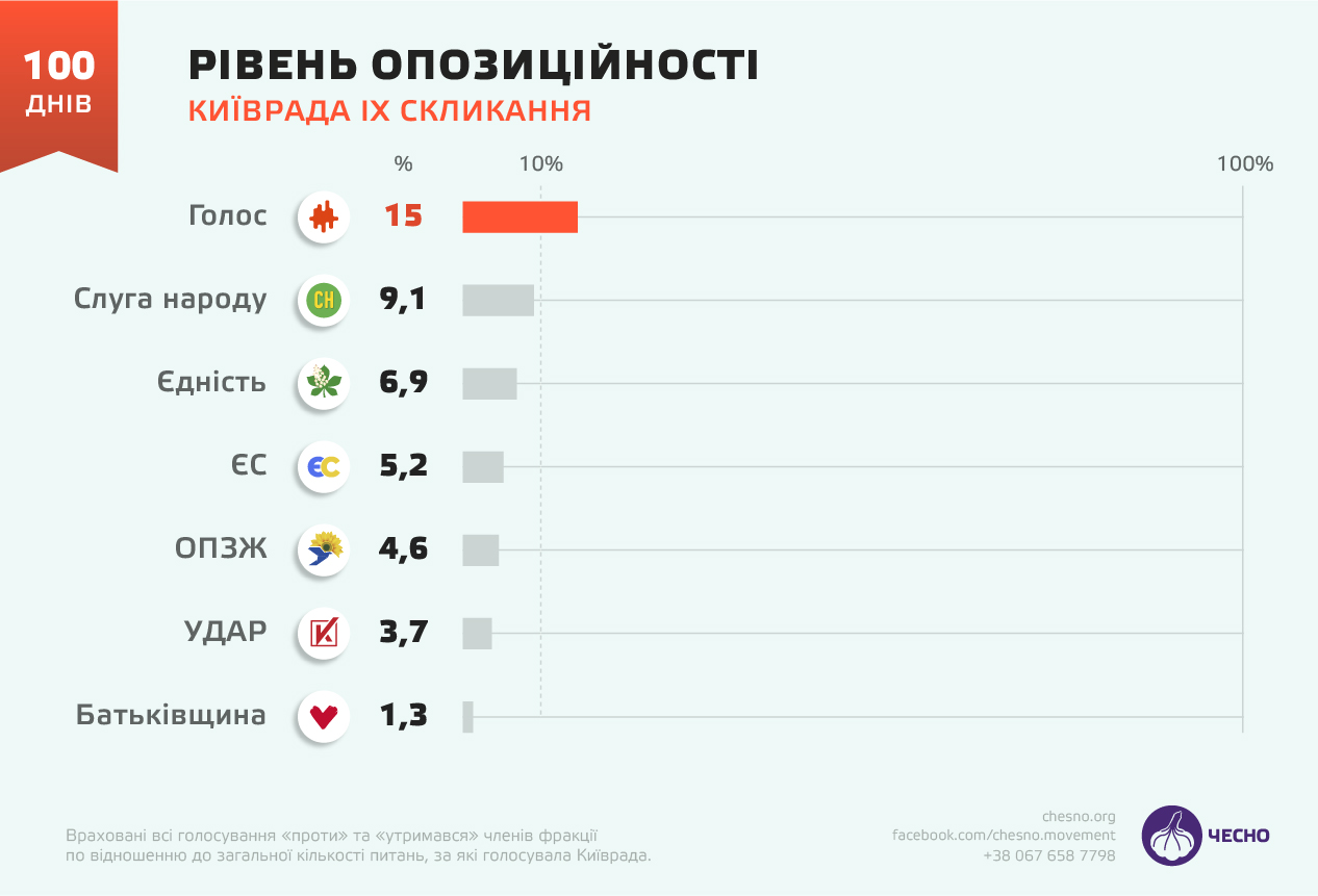 Найменша підтримка питань порядку денного від фракції ОПЗЖ, а найопозиційнішою є фракція “Голосу” - її депутати не підтримали 15% рішень.