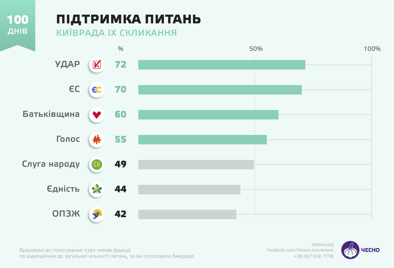 За даними громадського руху, представники партії ЄС підтримують близько 70% питань, УДАРу — 72%.