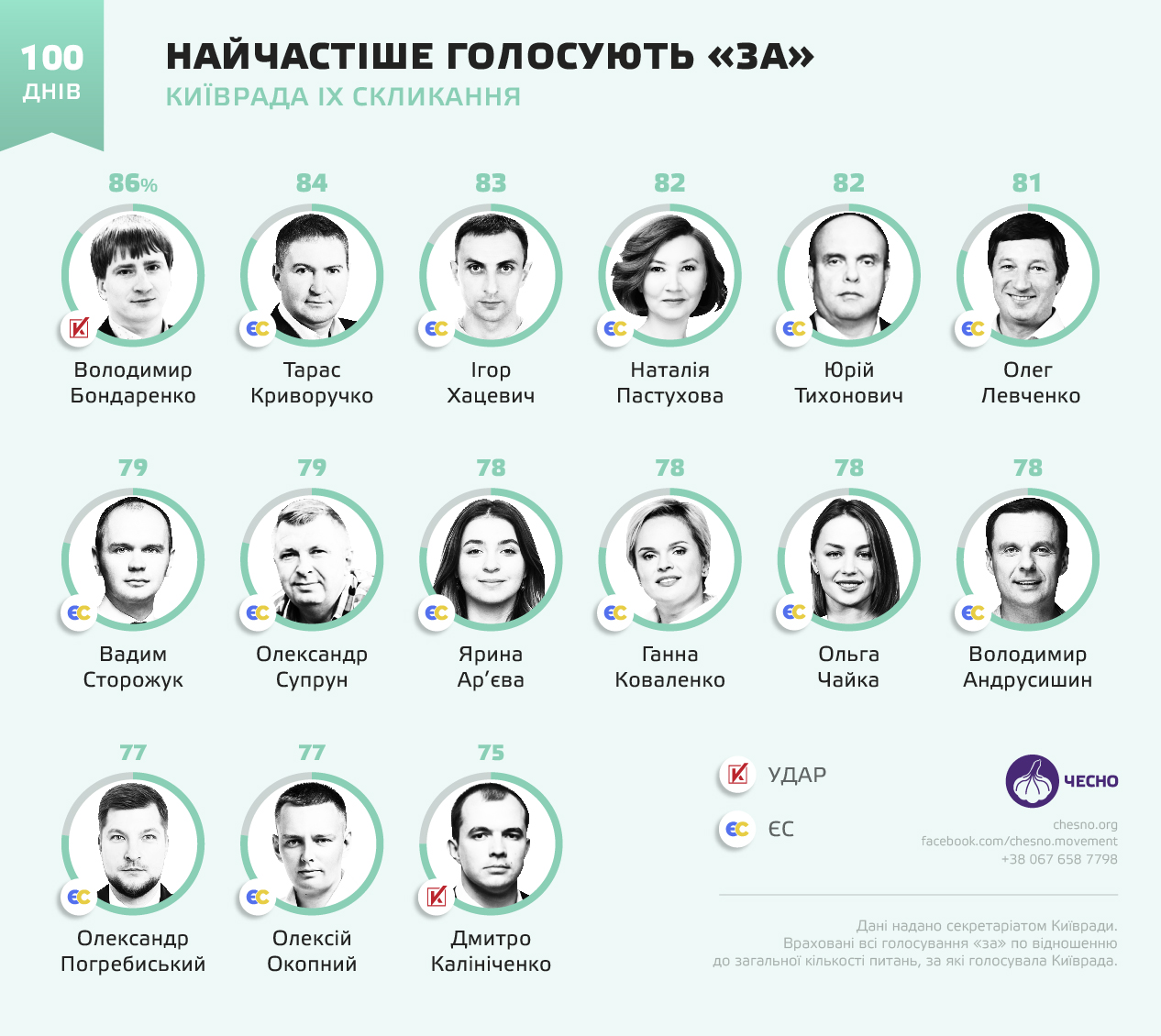 Найчастіше "за" голосує секретар Київради Володимир Бондаренко - він підтримує понад 86%, а картка київського міського голови Віталія Кличка відсутня майже у 67% випадків голосувань.