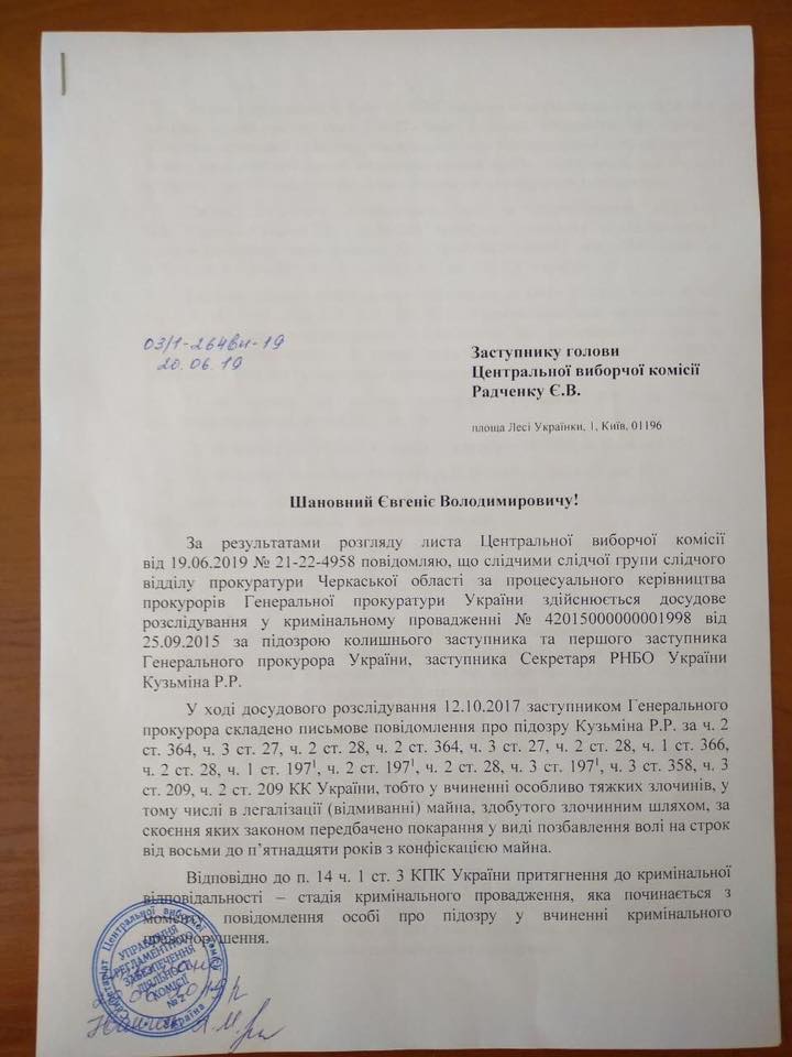 Водночас 20 червня на ім'я заступника голови ЦВК Євгена Радченка було направлено листа щодо колишнього заступника генерального прокурора Рената Кузьміна. У листі йшлося про розслідування кримінального провадження проти Кузьміна, якого підозрюють у вчиненні особливо тяжких злочинів, зокрема у "відмиванні" майна, здобутого злочинним шляхом, наголошує речниця Луценка.