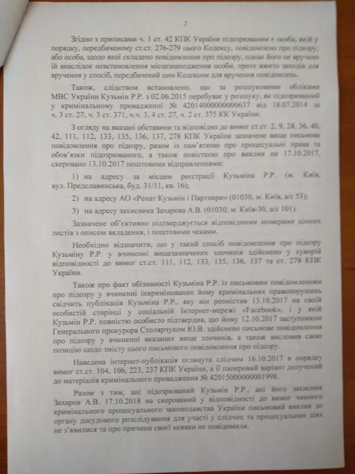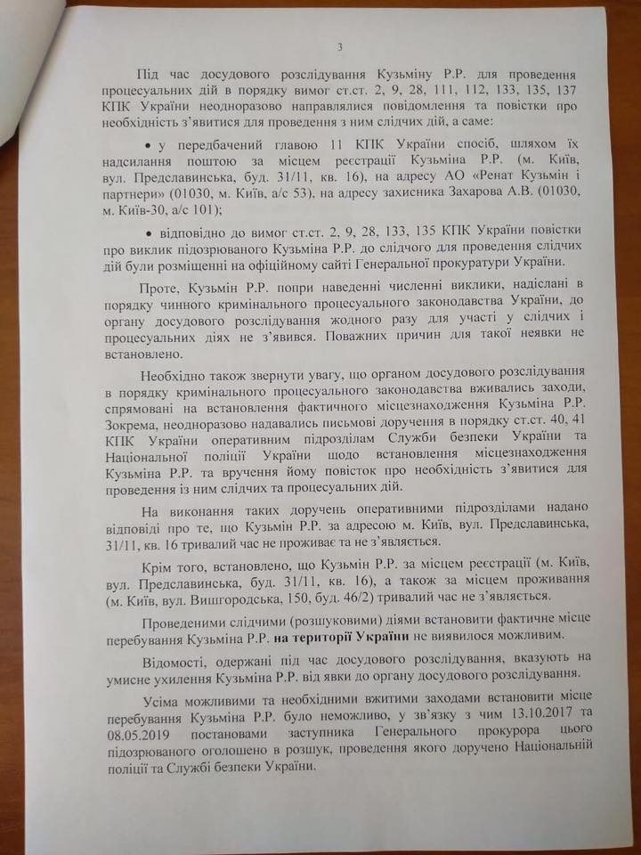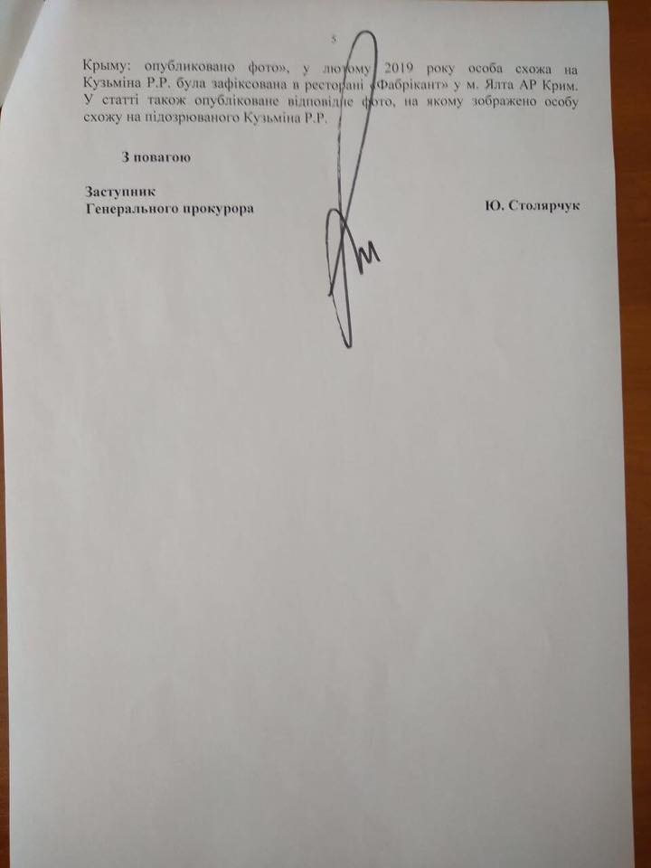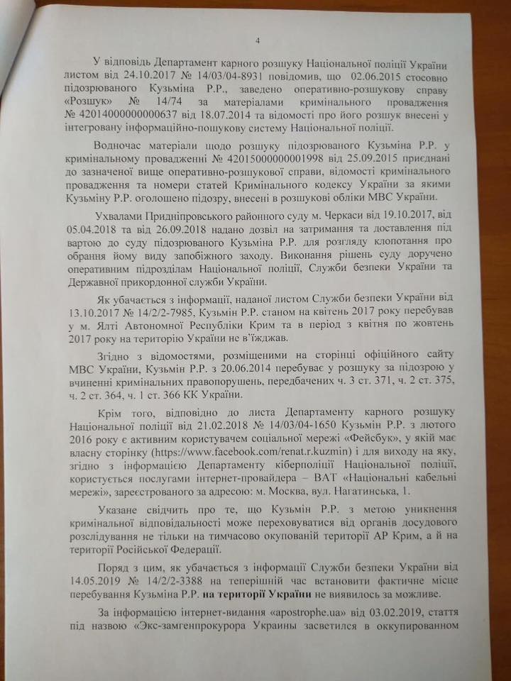 "У листі також вказано, що проведеними слідчими (розшуковими) діями встановити фактичне місцеперебування Р.Кузьміна на території України не виявилося можливим. Натомість постановами заступника генпрокурора підозрюваного оголошено в розшук, проведення якого доручено Національній поліції та СБУ", - наголошує вона.