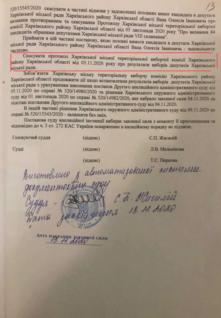 Суд анулював протокол про результати виборів до Харківської міської ради. Відповідне рішення Другий апеляційний адміністративний суд Харкова ухвалив у п'ятницю, 13 листопада, частково задовольнивши позов кандидата в депутати від «Слуги народу» Олексія Ваца, повідомили в обласній організації «Європейської Солідарності».