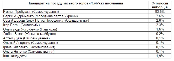 Кандидат від Молодіжної партії Сергій Адрійченко отримав 7,6% голосів виборців. Сергій Дорош від Блоку Петра Порошенка "Солідарність" і Ігор Реган від Об'єднання "Самопоміч" набрали 2,6% і 2,3% голосів виборців відповідно.