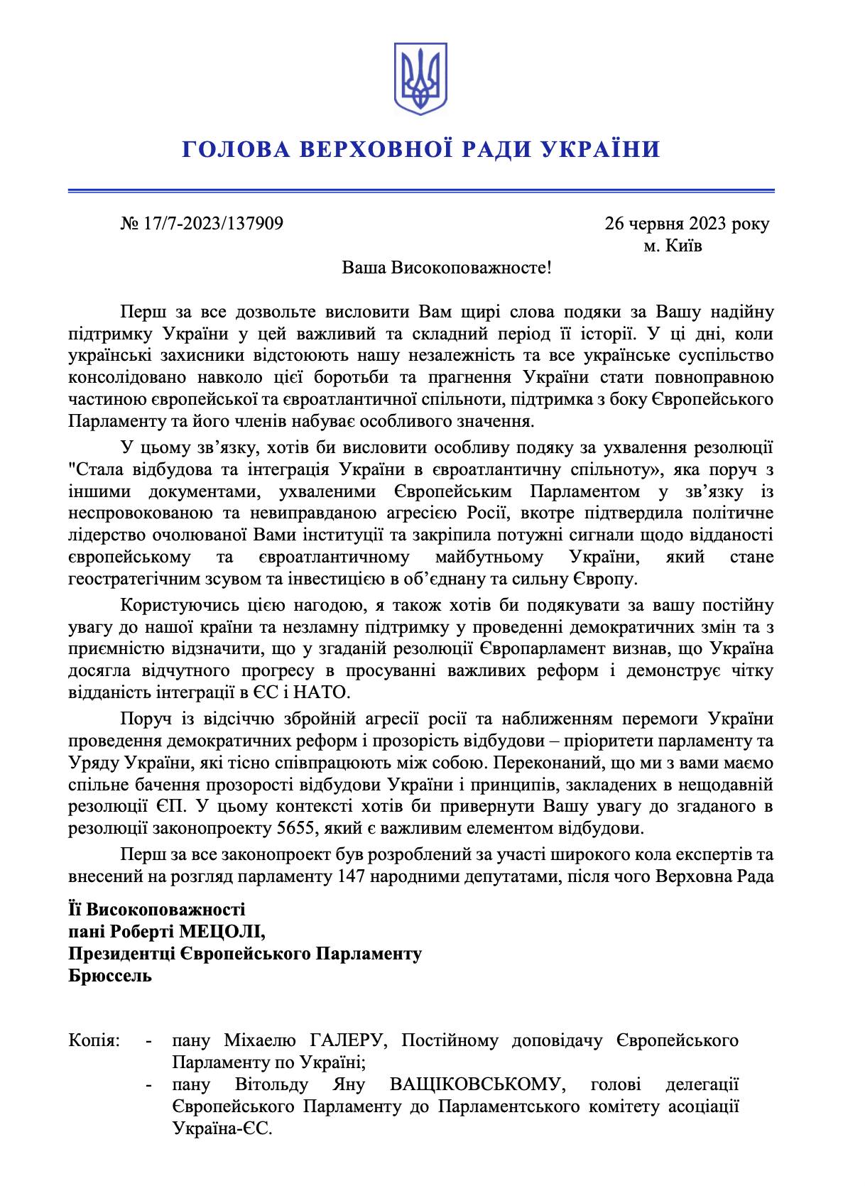 А 30 червня вже віцепрем'єр-міністр Олександр Кубраков на своїй сторінці у Facebook в черговий раз публічно підтримав законопроєкт. Також глава Мінвідновлення опублікував лист спікера парламенту Стефанчука президенту Європарламенту Роберті Міцолі, датований ще 26 червня.