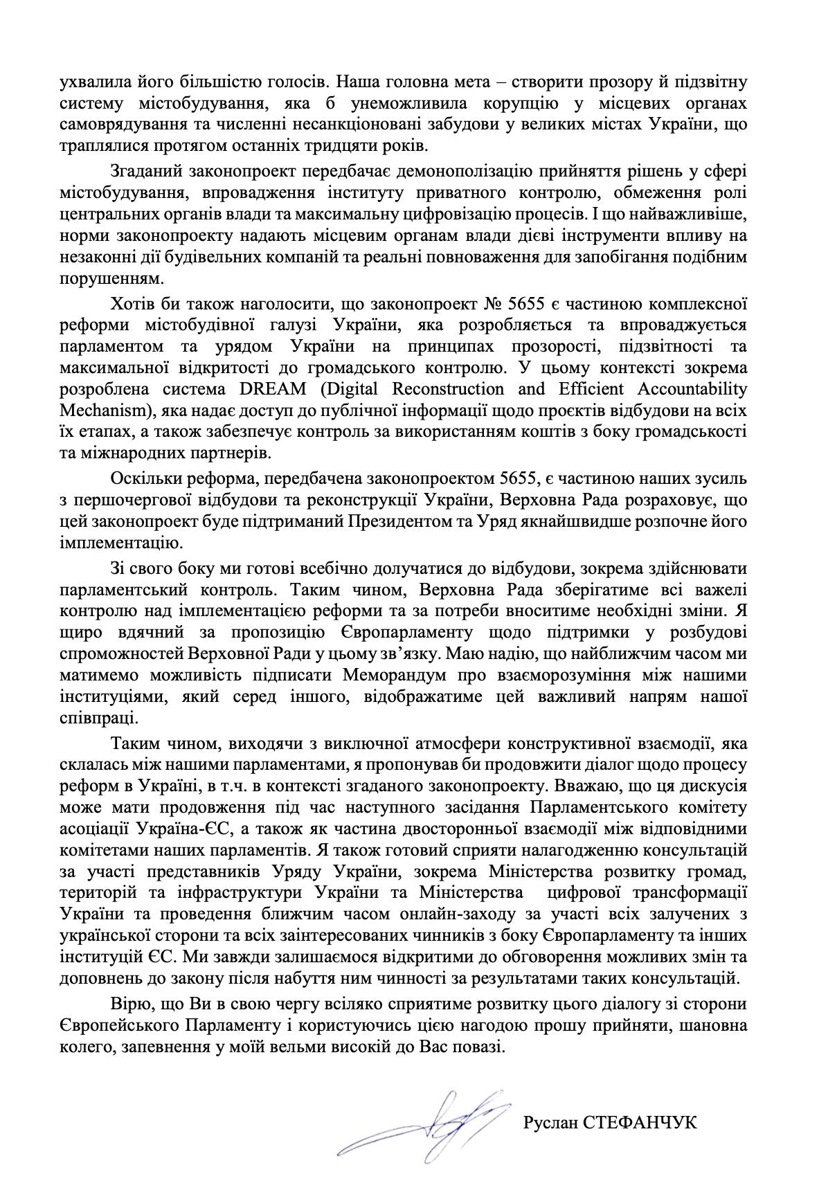 "Європарламент застерігає від використання майбутніх зусиль з реконструкції для внесення таких змін до законодавства, щоб принести користь певним інтересам за рахунок рівних умов гри та прозорості; закликає президента Зеленського не підписувати законопроєкт 5655 про містобудівну діяльність", — йдеться в резолюції.