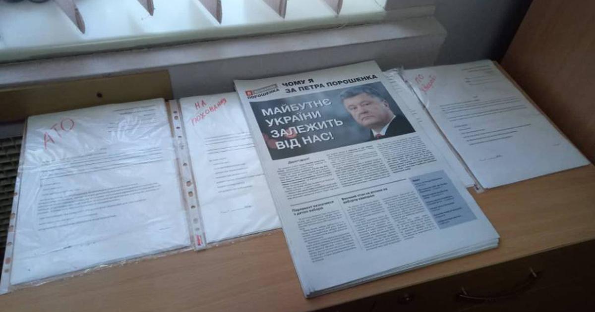 В будівлі міської ради Ірпеня активісти знайшли агітаційні матеріали за кандидата в президенти Петра Порошенка. Фото з агітаційними матеріалами Порошенка опублікував депутат міськради від партії "Свобода" Лаврентій Кухалейшвілі в Facebook.