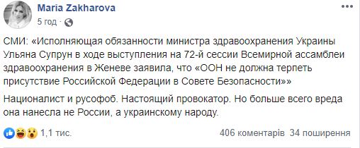 Представник МЗС РФ Марія Захарова звинуватила виконувачу обов'язків міністра охорони здоров'я України Уляну Супрун в "націоналізмі і русофобії". Заява прозвучала після призову Супрун з трибуни 72-ї сесії Всесвітньої асамблеї охорони здоров'я в Женеві до міжнародних організацій відмовитися від фінансової допомоги Росії і виключити країну-агресор з Ради Безпеки ООН.