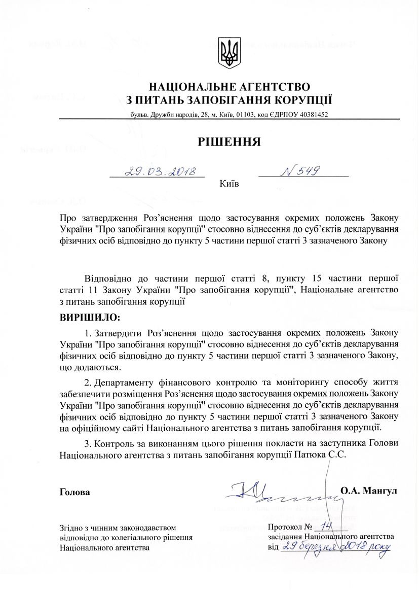Згідно з роз'ясненням, е-декларації можуть не подавати особи, які працюють в антикорупційних об'єднаннях, але безпосередньо не виконують функції в сфері запобігання та протидії корупції: офіс-менеджери, бухгалтери, прибиральники, постачальники продуктів харчування і канцелярського приладдя.