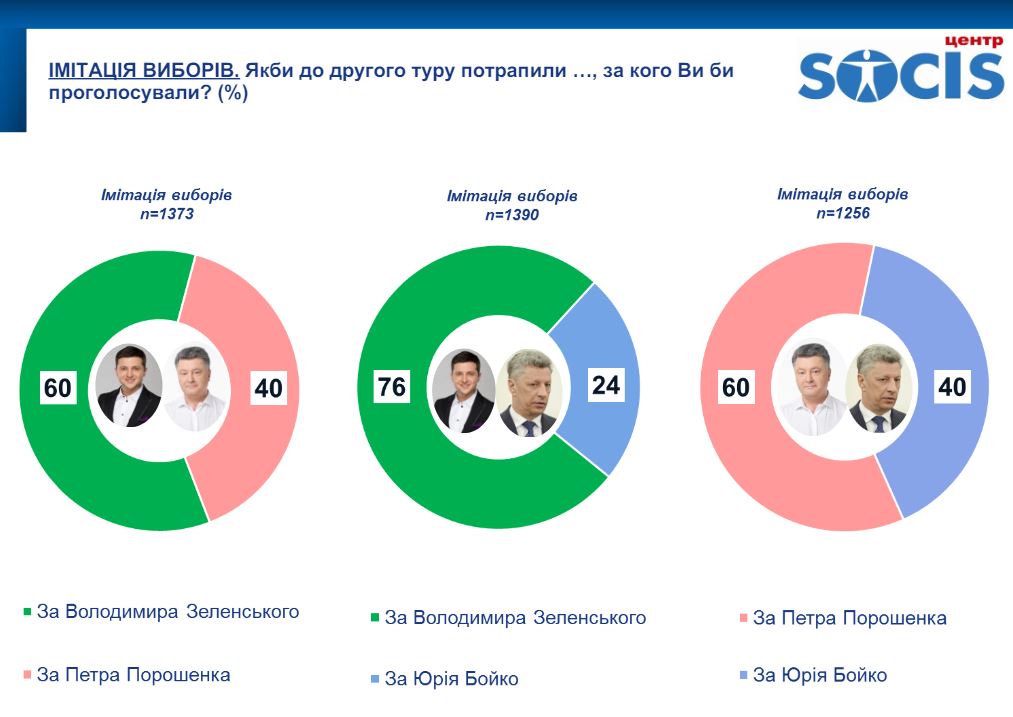 При цьому, якби у другий тур Зеленський вийшов з Порошенком, то чинний президент набрав би 60%, а колишній глава держави - 40%. У парі з Бойком Зеленський отримав би 76% голосів, а депутат ОПЗЖ - 24%. Щоправда, в парі Порошенко-Бойко перший обійшов би другого з результатом 60% проти 40%.