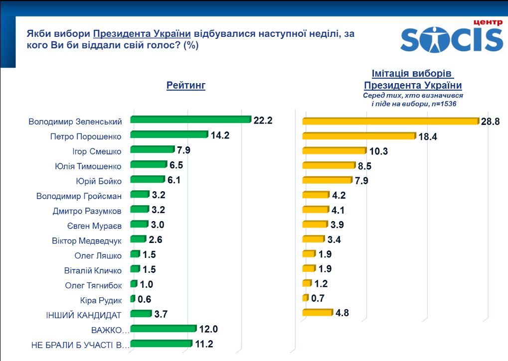 За п'ятого главу держави Петра Порошенка готові проголосувати 18,4% українців, а за лідера партії «Сила і честь» Ігоря Смешка - 10,3%. Лідера партії «Батьківщина» Юлію Тимошенко підтримали б 8,5% опитаних, а одного з лідерів «Опозиційної платформи - За життя» Юрія Бойка - 7,9%.