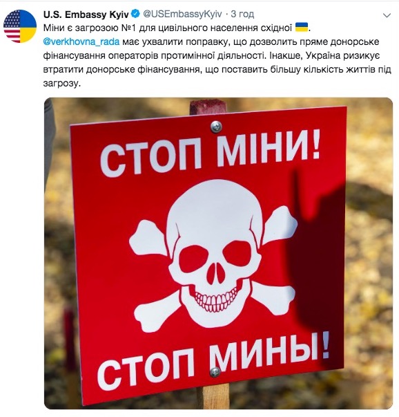 "Міни є загрозою №1 для цивільного населення східної України. Верховна Рада має ухвалити поправку, що дозволить пряме донорське фінансування операторів протимінної діяльності. Інакше Україна ризикує втратити донорське фінансування, що поставить більшу кількість життів під загрозу", - йдеться в повідомленні.