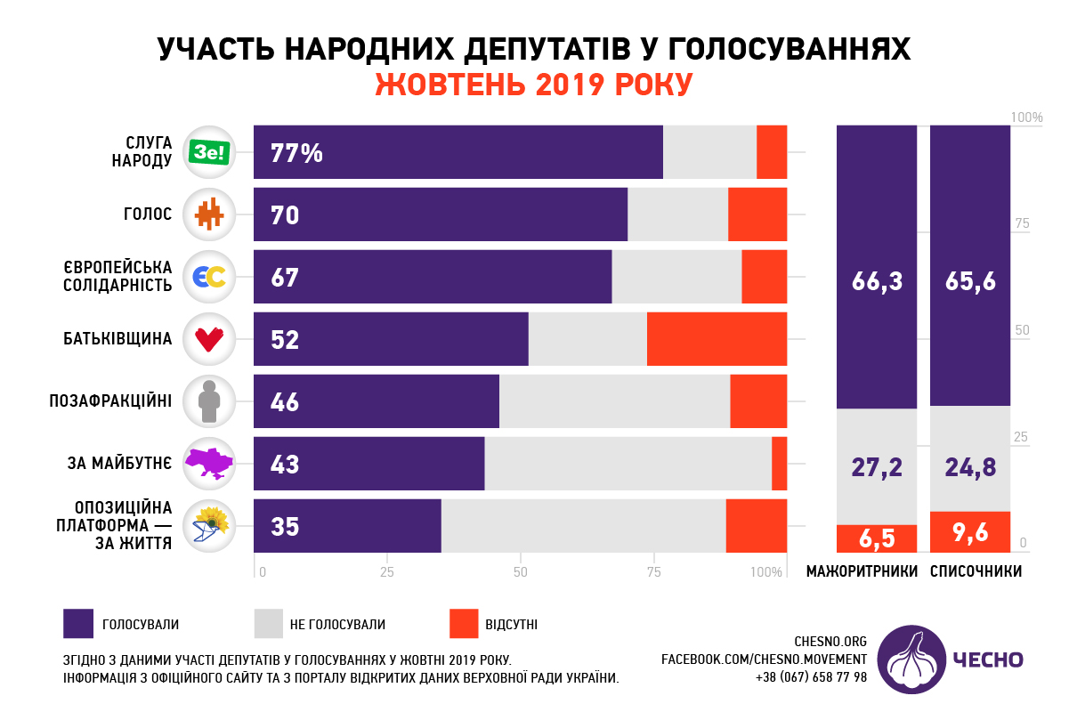 У жовтні 16 депутатів Верховної Ради пропустили більше 30% голосувань без поважних причин. Про це повідомляє рух "Чесно".