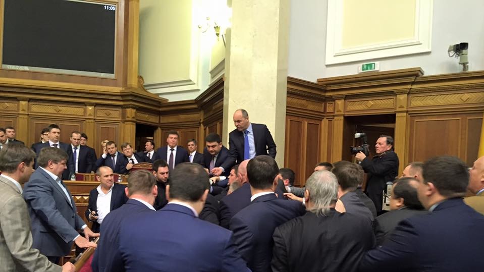 Бійка почалася між депутатами "БПП" і "Народного Фронту" після того, як народний депутат Олег Барна (фракція "Блок Петра Порошенка"), приніс на трибуну прем'єр-міністру букет троянд, перев'язаний чорною траурною стрічкою, підняв його на руки і спробував відтягнути главу уряду від трибуни. Зазначимо, що Барна збирає підписи під проект резолюції про недовіру уряду.