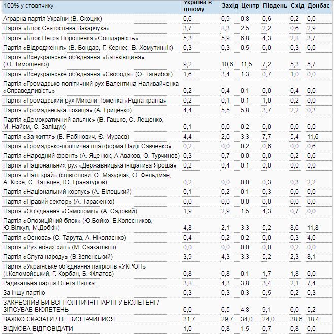 Якщо б вибори до Верховної Ради України відбувалися наприкінці вересня, то серед громадян, які вже визначилися з вибором і мають намір брати участь у голосуванні, 19,6% проголосували б за партію "Всеукраїнське об'єднання "Батьківщина", 11,2% - за партію "Блок Петра Порошенко", 10,1% - за партію "Опозиційний блок", 9,3% - за партію "За життя" Вадима Рабиновича, 9,3% - за партію "Громадянська позиція" Анатолія Гриценка, 8,2% - за партію "Слуга народу" Володимира Зеленського, 8,1% - за Радикальну партію Олега Ляшка, 7,9% - за партію "Блок Святослава Вакарчука".