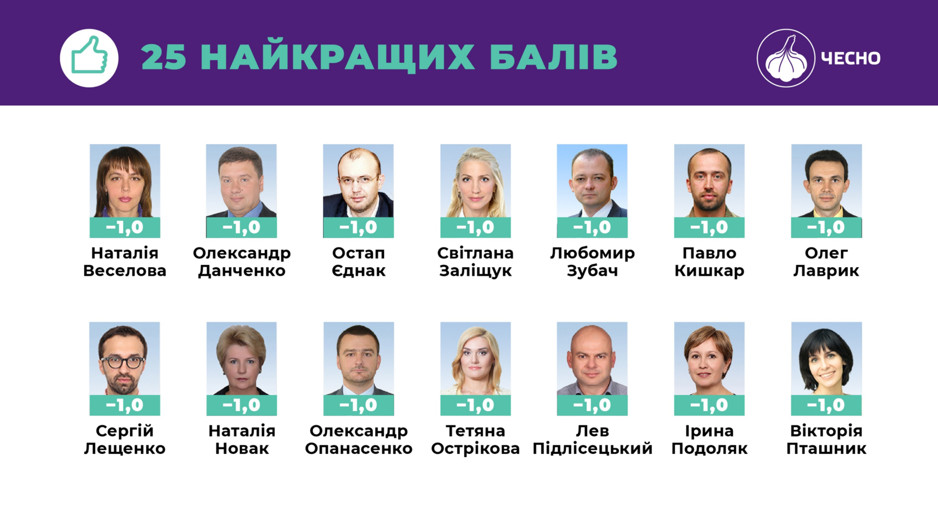 Серед дорброчесних депутатів активісти "Чесно" називають Сергія та Олега Соболєвих, Вікторію Пташник, Світлану Заліщук, Сергія Лещенка, Оксану Сироїд, Наталію Новак, Олексія Рябчина та інших.