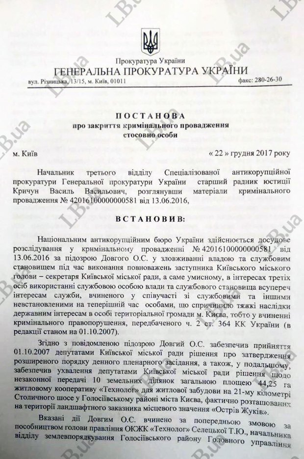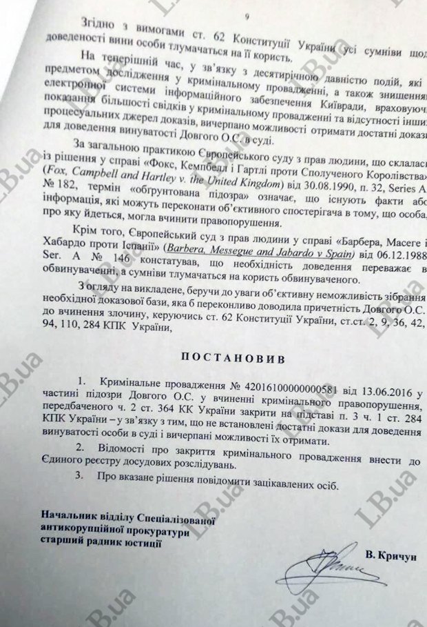 "Враховуючи вищевикладене, беручи до уваги об'єктивну неможливість збору необхідної доказової бази, яка б переконливо доводила причетність Довгого О. С. до скоєння злочину...,(начальник третього відділу САП В. Кричун, – ред.) постановив: кримінальне провадження... закрити у зв'язку з тим, що не встановлені достатні докази для доведення винуватості особи у суду і вичерпані можливості їх отримати", - йдеться в документі.