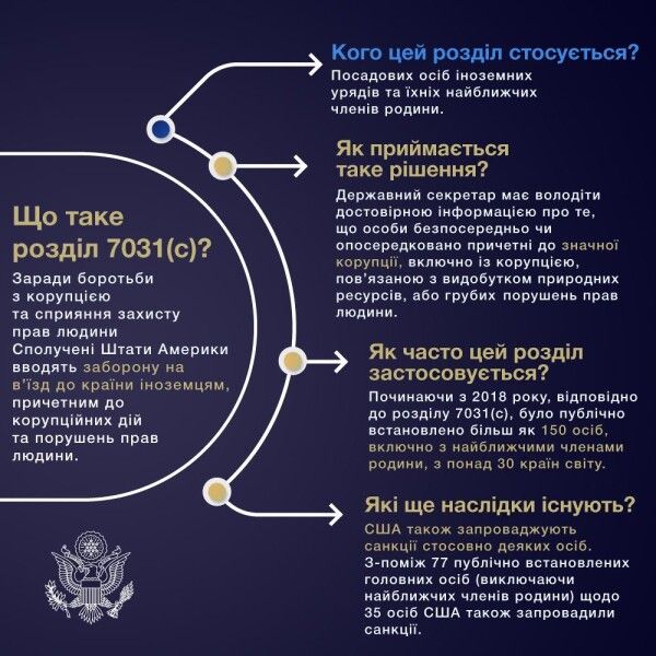 "Ми впроваджуємо цю глобальну програму санкцій, як і інші програми санкцій і програми підзвітності. Вони повинні впроваджуватися за допомогою дипломатів, іноземної допомоги та інших належних інструментів, що включає обмеження на в'їзд, розділ 7031 (С) від щорічного закону від Держдепу, який націлений на корумпованих чиновників", - заявив представник Держдепу.