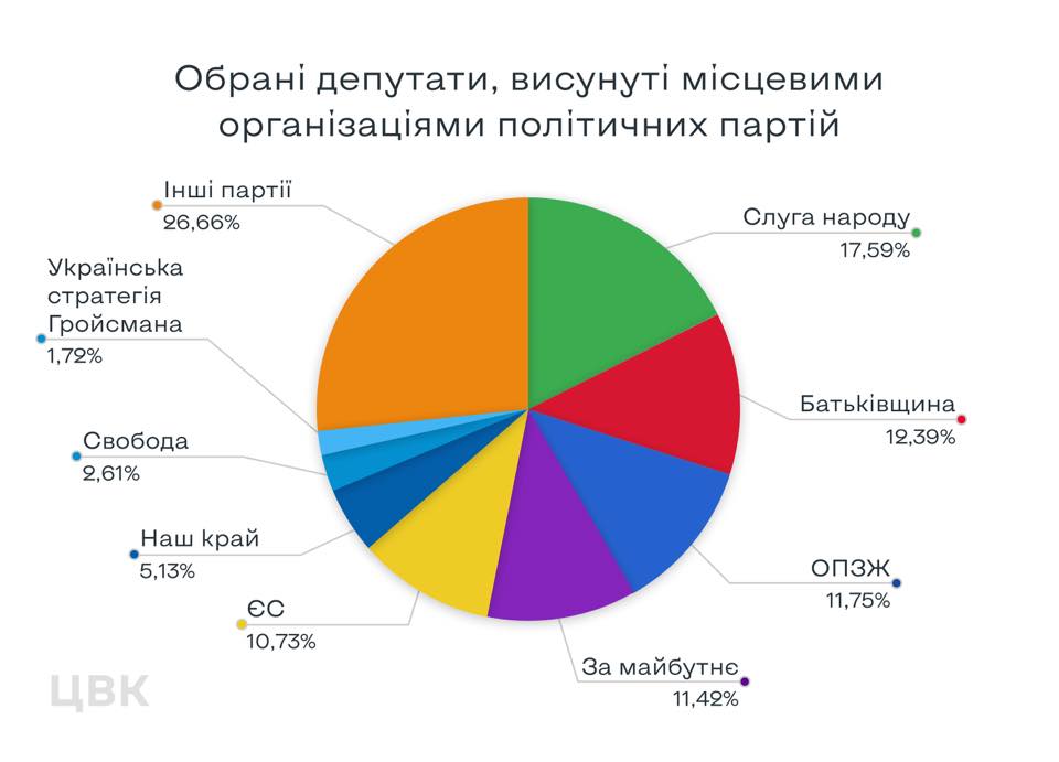 Найбільша кількість депутатів в раді різних рівнів за підсумками місцевих виборів 25 жовтня провели партії «Слуга народу», «Батьківщина», «Опозиційна платформа - За життя», «Європейська Солідарність» і «За майбутнє». Кожна з цих політсил отримала понад 10% від загальної кількості мандатів у місцевих радах, повідомляє Центральна виборча комісія за підсумками виборів у 1517 з 1577 місцевих рад.
