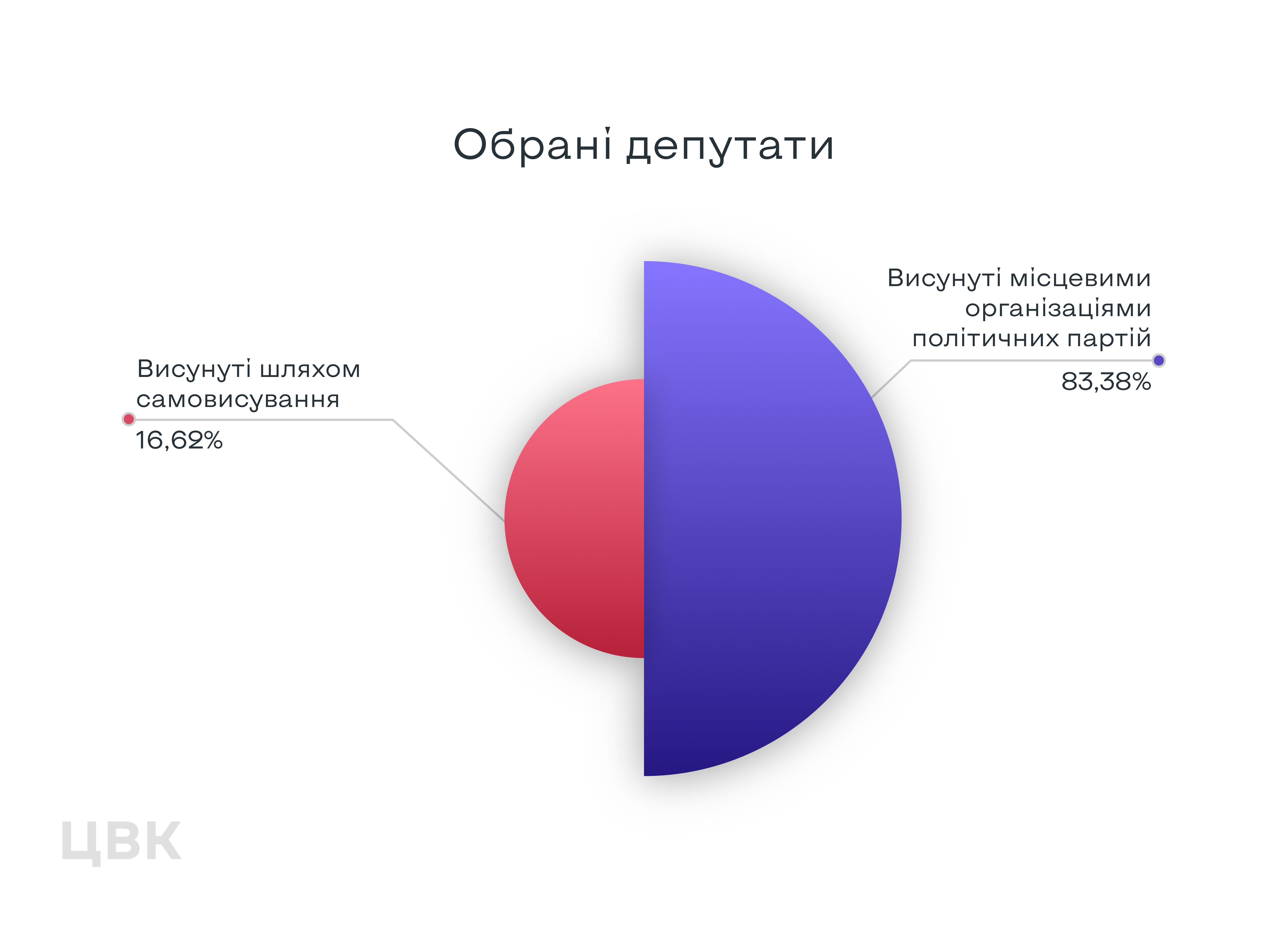 Уже оголошено обраними депутатами 33029 представників різних партій і 6586 самовисуванців. Таким чином, самовисуванці отримали 16,92% від загальної кількості мандатів і обігнали за цим показником лідера - «Слугу народу». Однак в ЦВК нагадали, що самовисуванці - це депутати в радах територіальних громад, де зареєстровано до 10 тисяч виборців і збереглася «мажоритарка». У більших населених пунктах вибори проводилися за пропорційною системою з відкритими списками. І всі кандидати там висувалися політичними партіями.