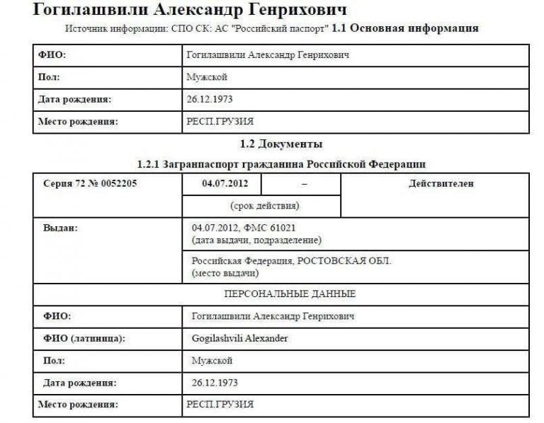 За даними Федеральної податкової служби РФ, паспорт №6004531705 Гогілашвілі отримав 12 листопада 2003 року у Ленінському районі Ростова-на-Дону. Також він має чинний індивідуальний податковий номер (ІПН) РФ 616404621705.