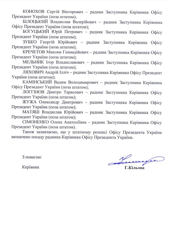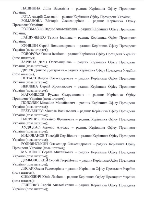 Серед радників є такі публічні особи, як Михайло Подоляк та Сергій Лещенко – обидва є радниками керівника офісу президента поза штатом.