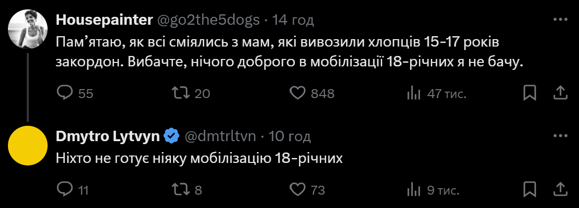 «Ніхто не готує жодну мобілізацію 18-річних», – написав Литвин у соцмережі Х у відповідь на пост про доцільність вивезення за кордон хлопчиків 15-17 років, мовляв, «нічого доброго в мобілізації 18-річних» немає.