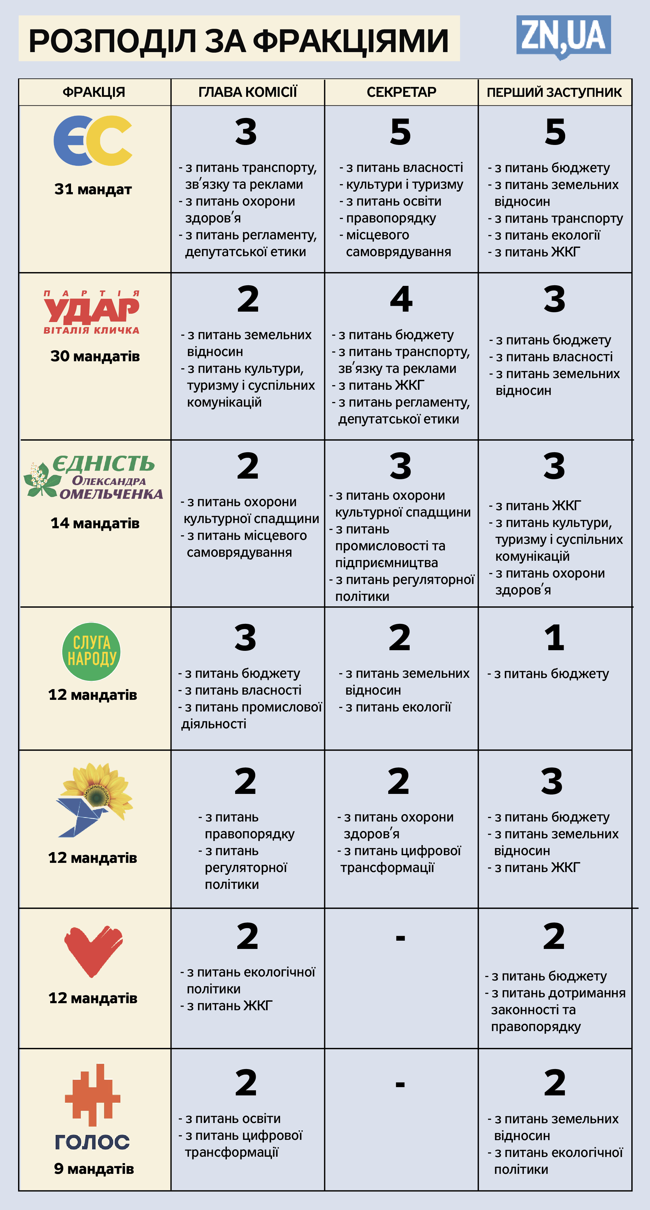 Партія влади «Слуга народу», поступившись Кличку позицією секретаря Київради — ним на минулому засіданні був обраний давній соратник мера столиці УДАРівець Володимир Бондаренко, — отримала три портфелі голів комісій. Практично нарівні з ЄС і УДАРом, які виграли вибори у столиці. Київрада, куди зайшли всього сім партій (ЄС — 31, УДАР — 30, «Єдність» — 14, «Батьківщина» — 12, СН — 12, ОПЗЖ — 12 і «Голос» — 9), на сьогоднішньому засіданні розподілила ключові пости.