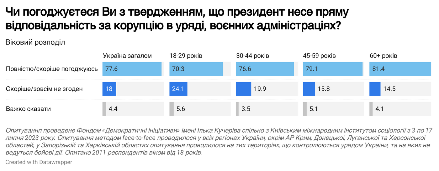 При цьому українці старшого віку більш вимогливі до президента, ніж молодь. Якщо серед опитаних віком 18–29 років 70% погоджуються з тезою, що глава держави несе відповідальність за корупцію, то серед людей віком 60+ частка критично налаштованих зростає до 81%.