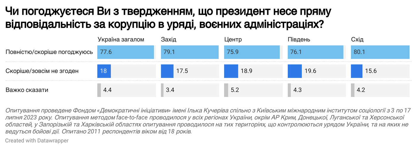 Серед українців 78% вважають, що президент країни несе пряму відповідальність за корупцію в уряді та воєнних адміністраціях. Не погоджуються з цим твердженням лише 18% опитаних, йдеться в опитуванні фонду Демократичні ініціативи імені Ілька Кучеріва.