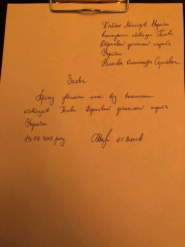 "Шановний пане Президенте..! Поважаючи вас, як Верховного Головнокомандувача, гаранта Конституції України, пишу заяву про увільнення від виконанння обов'язків голови Державної фіскальної служби. У понеділок направлю цю заяву до Кабінету міністрів України", - написав Власов у своєму Facebook.