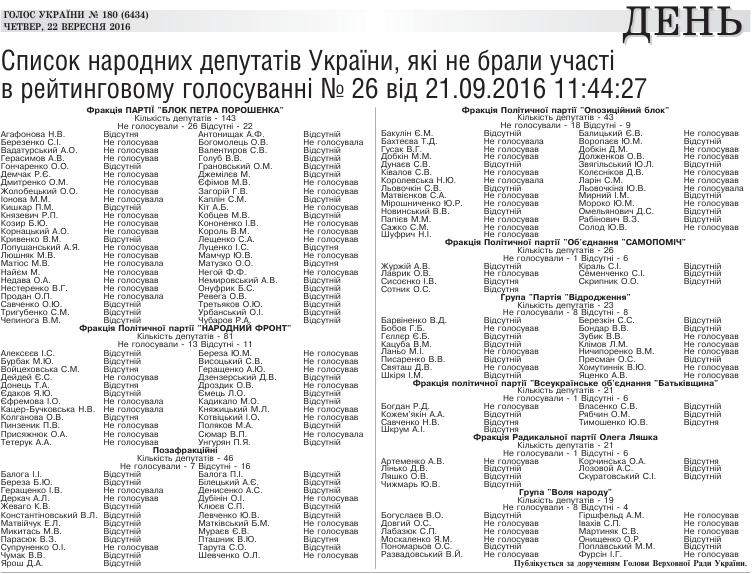 Офіційне видання Верховної Ради газета "Голос України" опублікувала список народних депутатів, які були відсутні під час голосування 21 вересня.