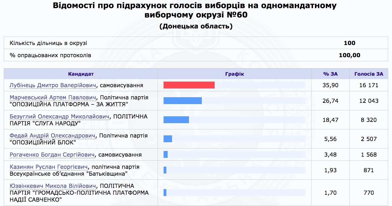 В одномандатному виборчому окрузі №60 Донецької області на виборах до Верховної Ради переміг чинний народний депутат, самовисуванець Дмитро Лубінець. Згідно з даними на сайті Центрвиборчкому, за нього проголосували 35,90% виборців (16 171).