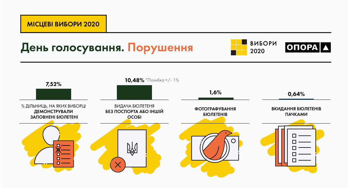Так, найпоширенішим порушенням в організації назвали спроби незаконного отримання виборцем і видачі дільничною виборчою комісією бюлетенів для голосування. Подібні випадки, які не були масовими, зафіксували на 10,4% дільничних виборчих комісіях (статистична похибка 2,3%). При цьому під час місцевих виборів 2015 року таких порушень також було найбільше, однак його фіксували на 17,7% ДВК. За даними спостерігачів, на 0,29% ДВК такі порушення були непоодинокими.
