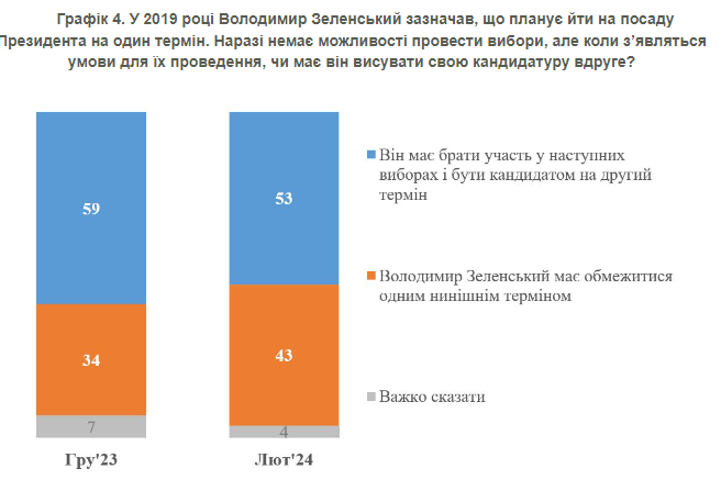 Натомість із грудня 2023 до лютого 2024 року з 34% до 43% зросла частка тих, хто вважає, що Володимиру Зеленському варто обмежитись одним терміном.