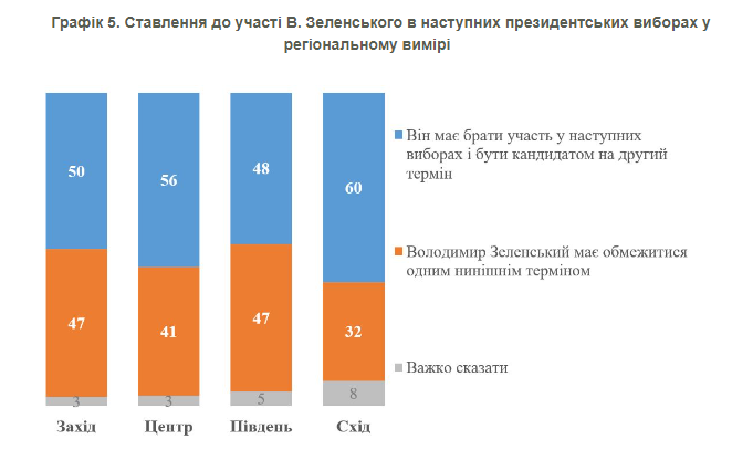 Умовно найменше підтримують участь Зеленського у наступних виборах президента мешканці заходу і півдня України, відносно ж найбільше – центру і сходу.