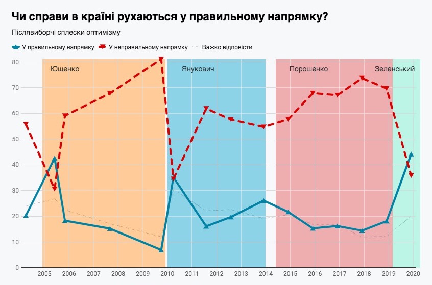 Так, наприкінці 2018 року, навпаки, 70% вважали напрям руху країни неправильним і лише 18% – правильним (12% не визначилися). Останній раз переконання у правильності напряму переважало в громадській думці після президентських виборів у червні 2005 року (тоді 42% вважали напрям руху країни правильним, 31% – неправильним), але вже в листопаді 2005-го думка суттєво змінилася: 59% вважали прямування країни неправильним і лише 18% – правильним.